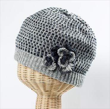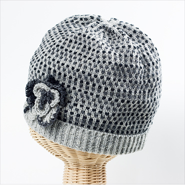 軽くて温かいシェットランドヤーンで編まれたワッチ。ベーシックカラーの組み合わせなので洋服と合わせやすく、アクセントのお花も控えめで甘くなりすぎない印象の帽子です。