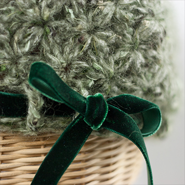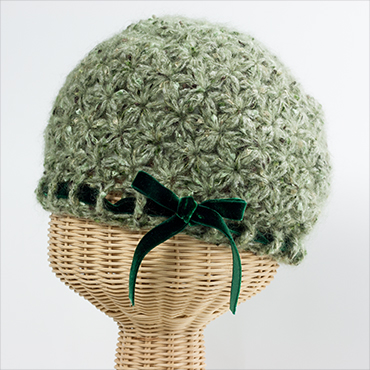モヘア糸の柔らかさがそのまま活かされるように、麻の葉がらで編み上げています。ふんわりと、とても軽い仕上がり。グラデーションのヤジリモールを合わせて深みのある色合いに。リボンはデザインポイントなだけでなく、サイズに合わせて絞ってお使いいただけます。