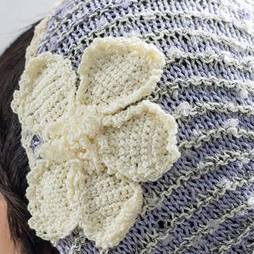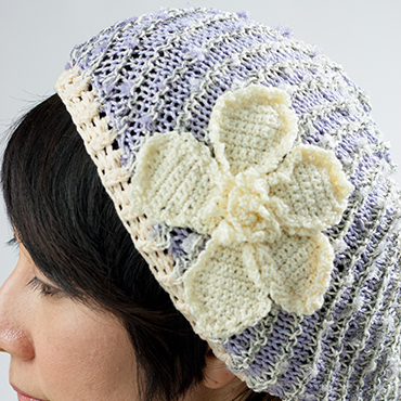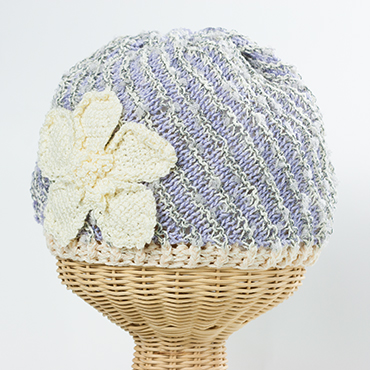 グラデーションの花モールを引き揃えたので、見る角度によって色合いに変化があります。緑と花モチーフが全体を引き締めた印象に。深くかぶってもたるみが少しある大きさです。被り口は伸縮性のある糸を使っています。