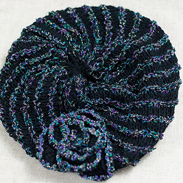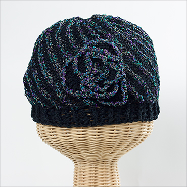 繊細なスリット糸と光沢のあるノットヤーンを配色し、凹凸のある編み地で仕上げました。バラのモチーフ付きビーニー。 サイズ元に伸び止めのゴムカタンが通してあります。